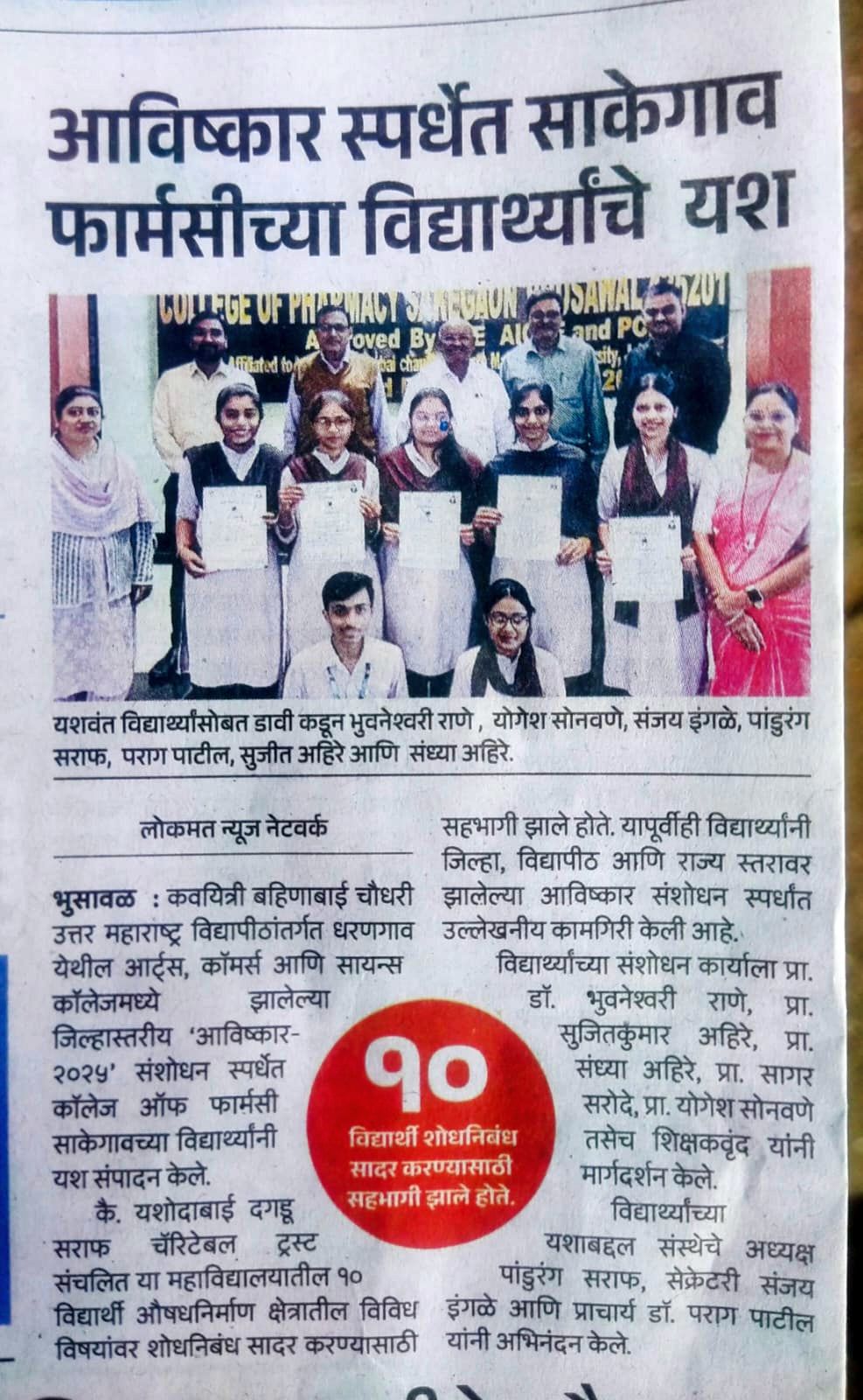 अविष्कार स्पर्धेत साकेगाव फार्मसीच्या विद्यार्थ्यांचे यश