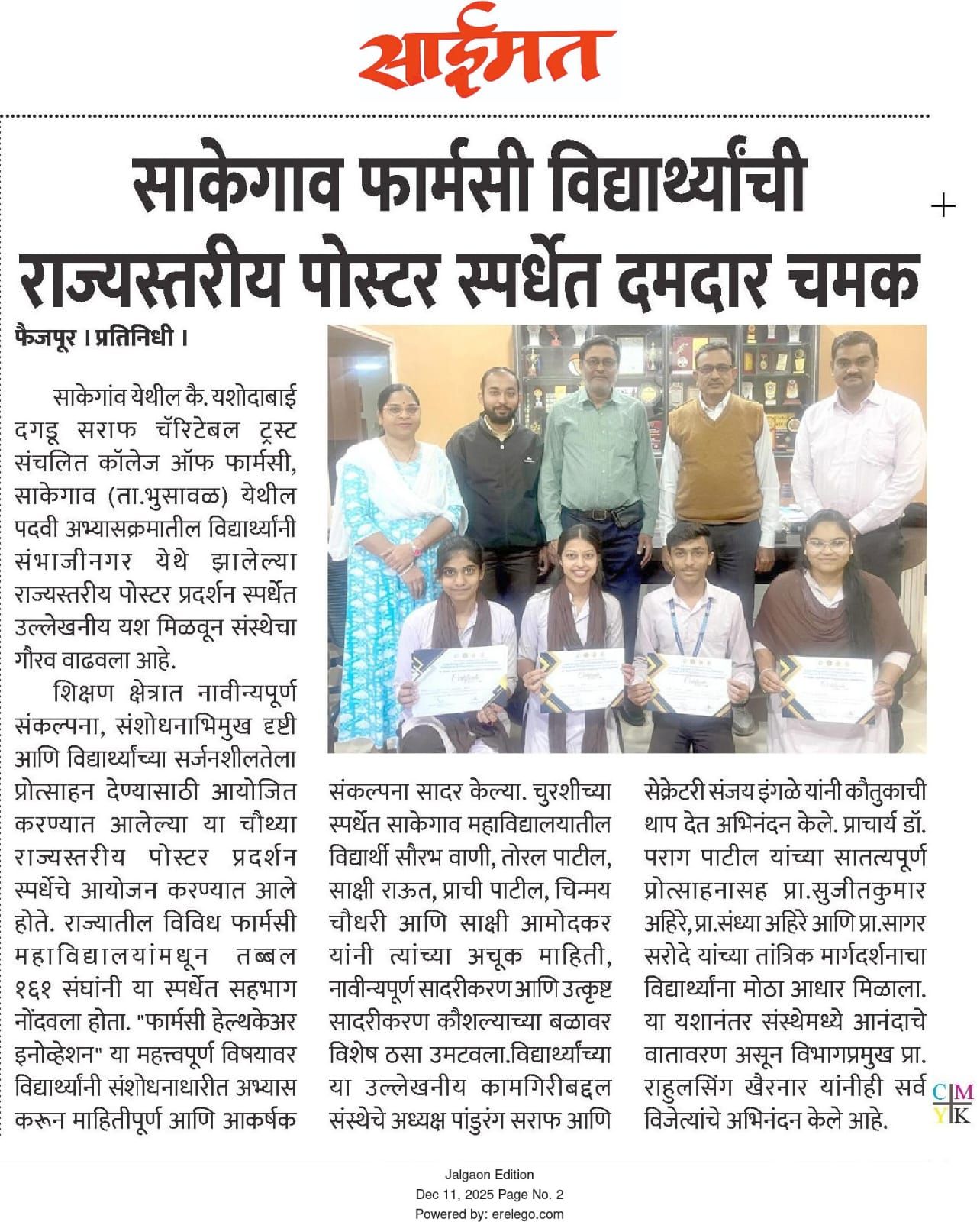 साकेगाव फार्मसीच्या विद्यार्थ्यांची राज्यस्तरीय पोस्टर स्पर्धेत दमदार चमक