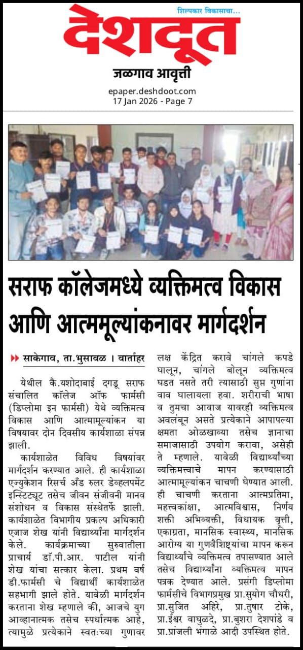सराफ फार्मसी कॉलेजमध्ये 'उद्योगजकता विकास कार्यशाळा' संपन्न झाली .